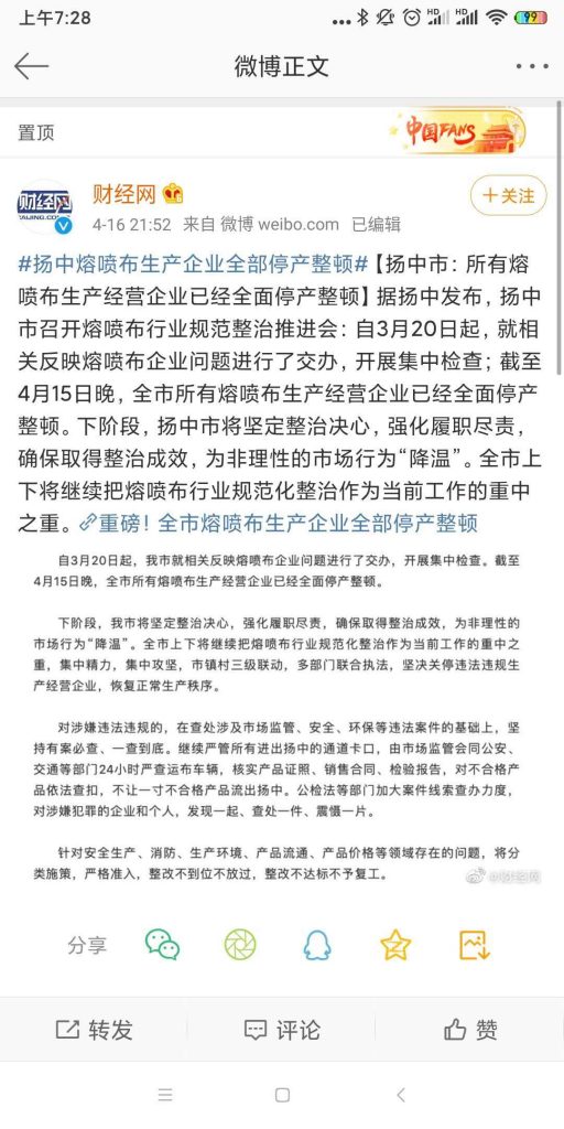 這兩天國內部分地區集中整頓熔噴布市場上了熱搜,國家已經開始整治熔噴布亂象了,下一步,安評、環評、衛生一卡可能好多小工廠都不能生產了,已經能看到有小作坊甩賣生產線的了,對應的那些手續齊全的將會更加如魚得水,開始熔噴布整治短期內價格不好降,部分緊缺的還有可能上升,短期內大幅降價幾無可能。