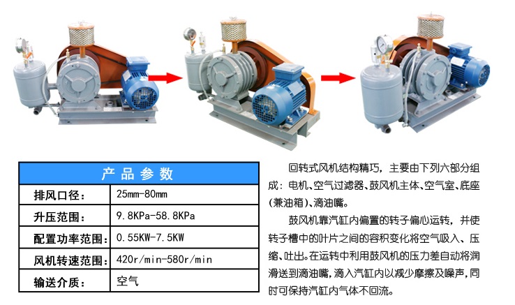 因此經常檢查空氣濾清器是否臟了,如臟了可拆卸下空氣濾清器,旋開蝶型螺母,拿開蓋子,清洗過濾海綿,用肥皂水浸泡晾干即可。回轉式鼓風機潤滑油的作用、如何自動循環的。風機運轉時,由滴油嘴往氣缸體內滴入必要的潤滑油,因為轉子槽內的4根葉片產生往復運動,將空氣吸進、壓縮、排出,構成風機、葉片和轉子、氣缸體相互磨擦,產生發熱。潤滑油使表面潤滑,以減小摩擦熱和磨擦噪音;并使部件之間形成一層油膜,保持風機的密封性。潤滑系統是利用回轉風機工作時產生的壓力差而形成的自動供給機油的循環裝置,所以回轉式鼓風機不能空負載運轉。希望大家看了小編的介紹能有一定的幫助,可以一一對應看看問題出在哪里,然后做出相應的措施。